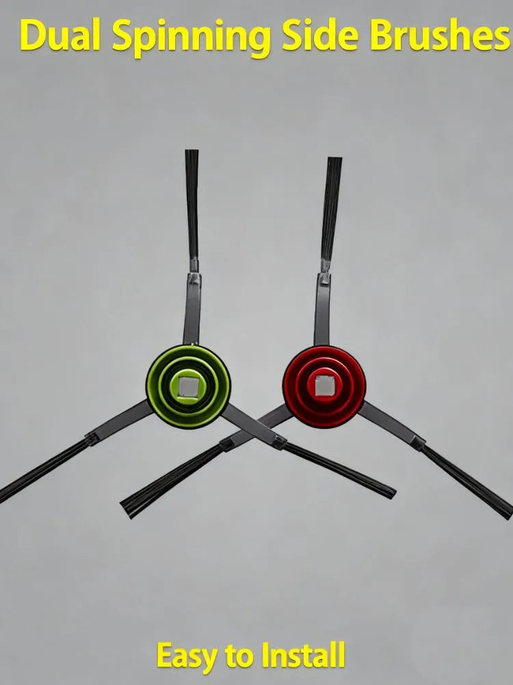 - Components: Includes dual spinning side brushes (red & green), high-quality filters, dust bags, main brush, and mop pads.